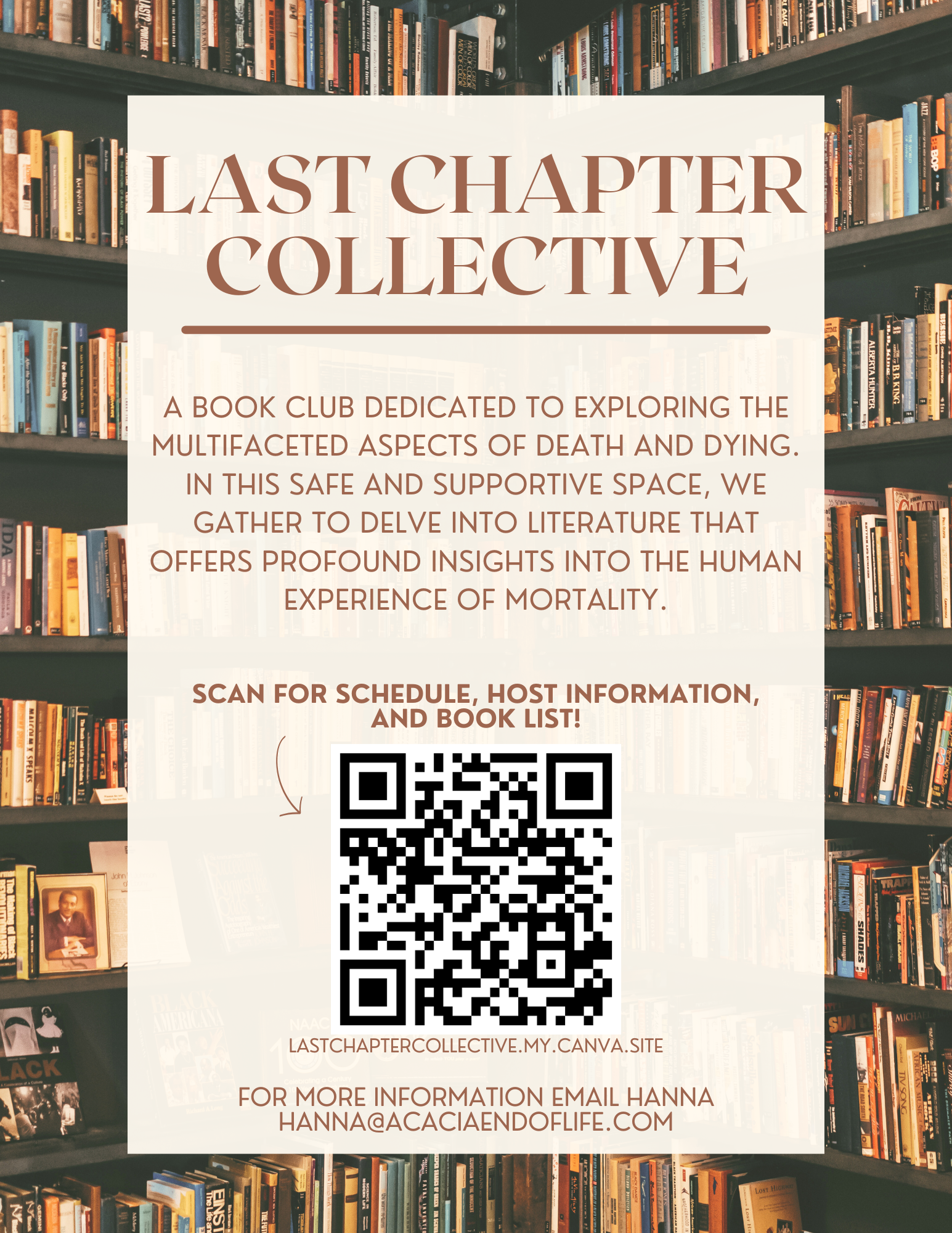 A book club dedicated to exploring the multifaceted aspects of death and dying. In this safe and supportive space, we gather to Dive into literature that offers profound insights into the human experience of mortality.